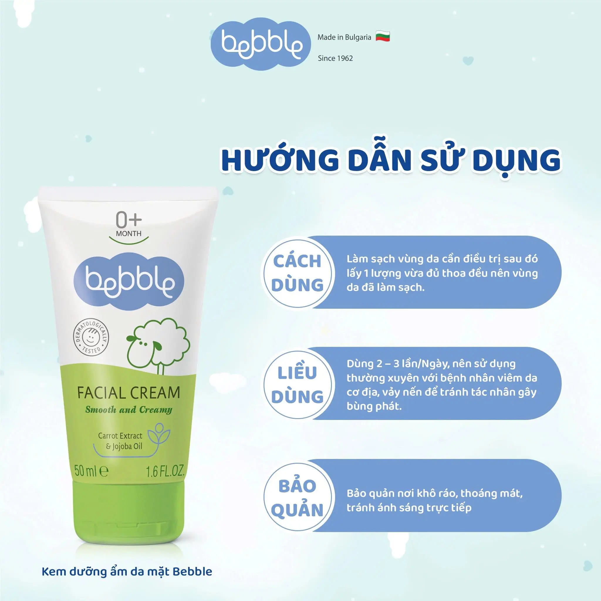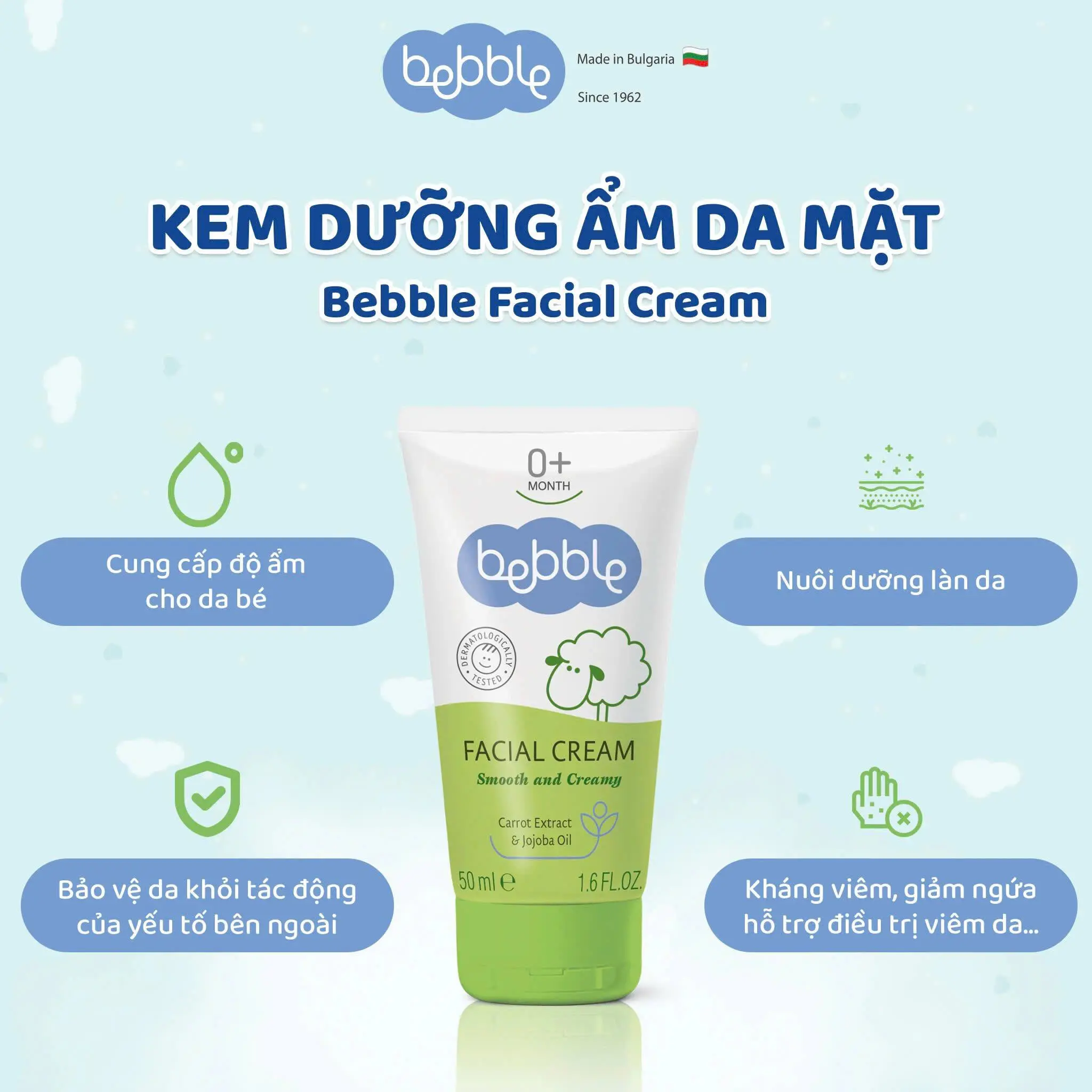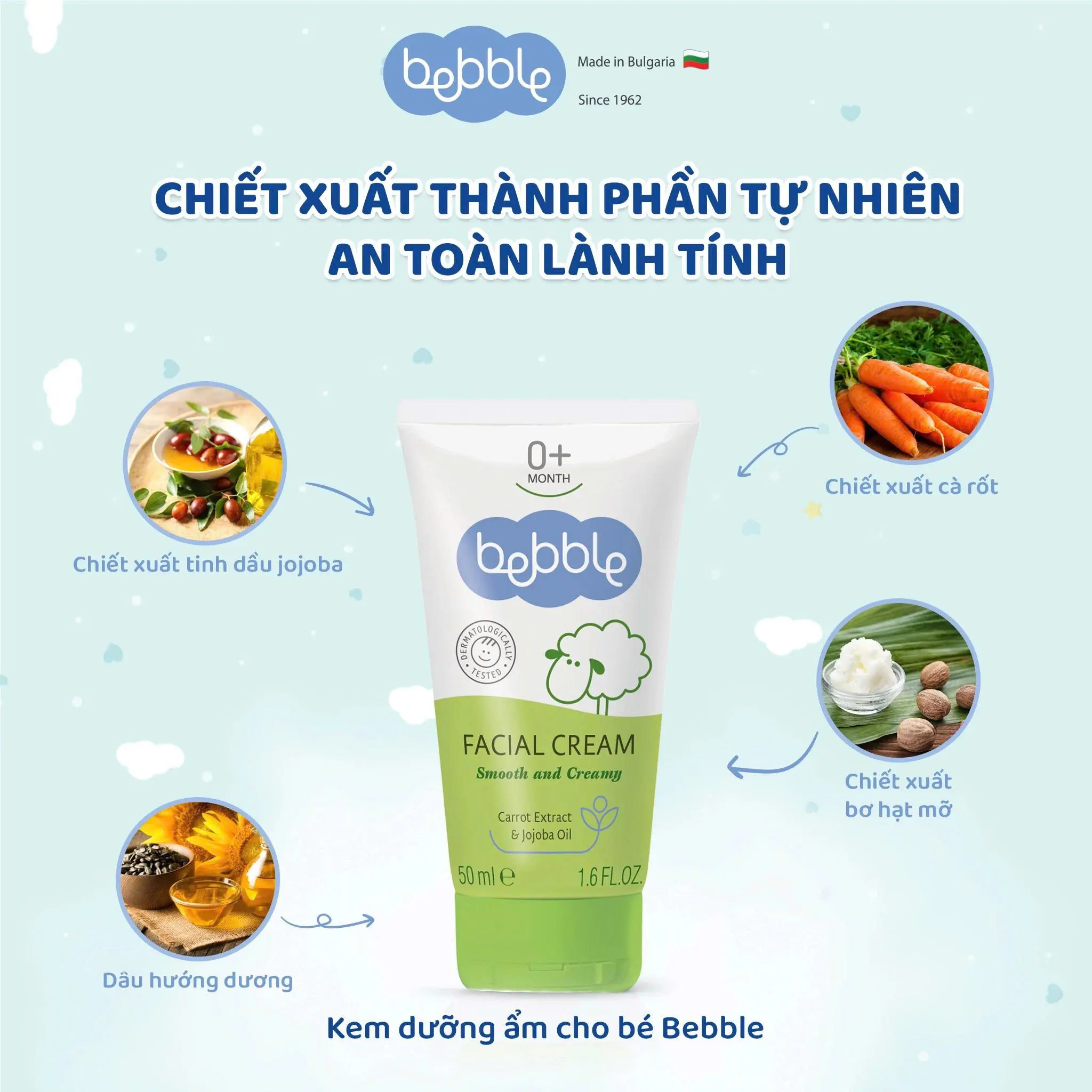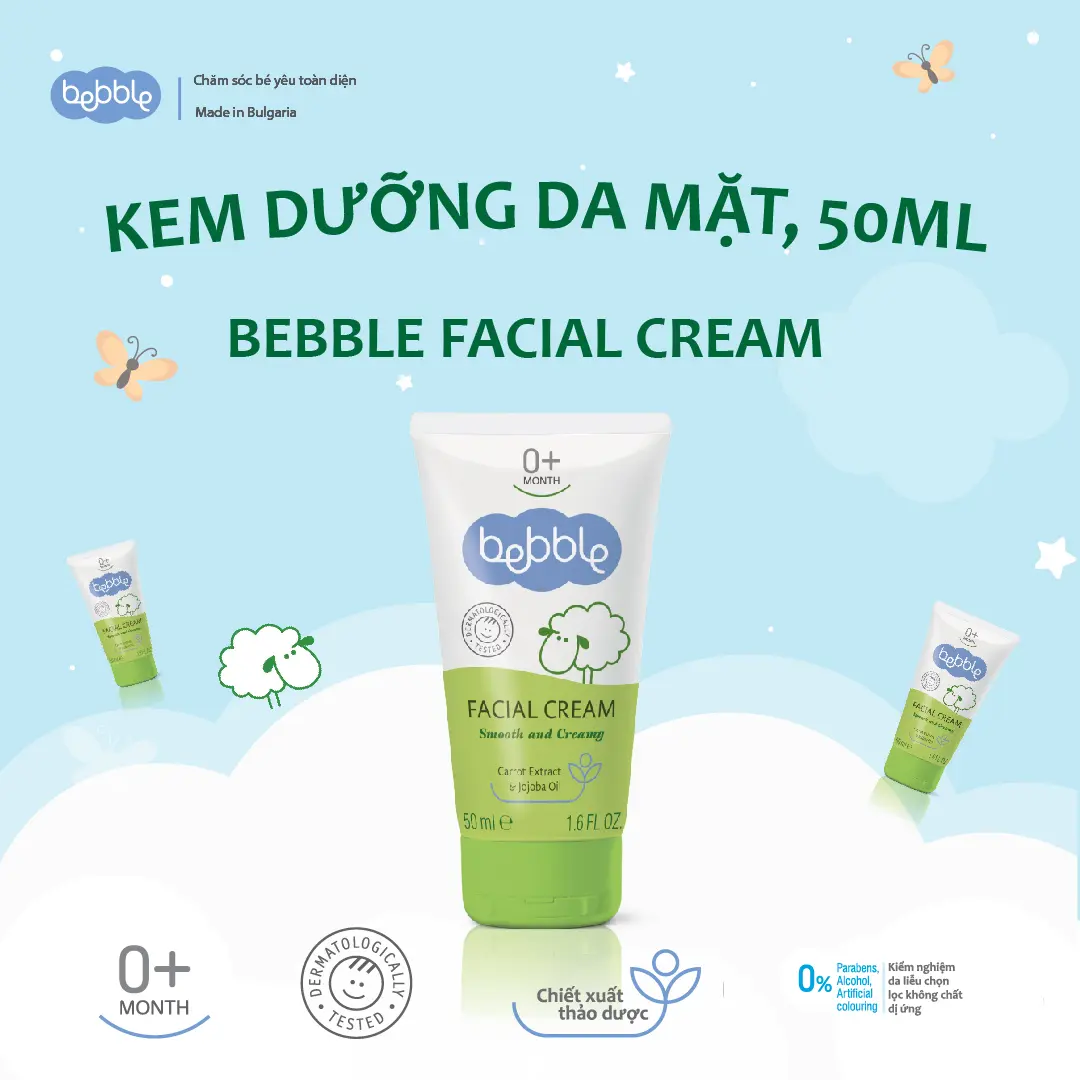 🌿Kem dưỡng ẩm Bebble Facial Cream 50ml: là sự kết hợp của 6 loại dầu tự nhiên, bao gồm: tinh dầu Jojoba, dầu oliu, dầu hạnh nhân ngọt, dầu đậu nành, dầu hướng dương và bơ hạt mỡ. Nhờ thế, sản phẩm có khả năng cung cấp nhiều dưỡng chất cho da như các vitamin A và E, đồng thời khang vi.em và ngăn chặn vi khuẩn hiệu quả. Ngoài ra, chiết xuất cà rốt cùng sự bổ sung lượng vừa đủ của vitamin E tạo nên lớp màng bảo vệ vô hình, đẩy lùi tác hại của ánh nắng mặt trời và chống oxy hóa hiệu quả, tăng cường hệ miễn dịch cho da bé.