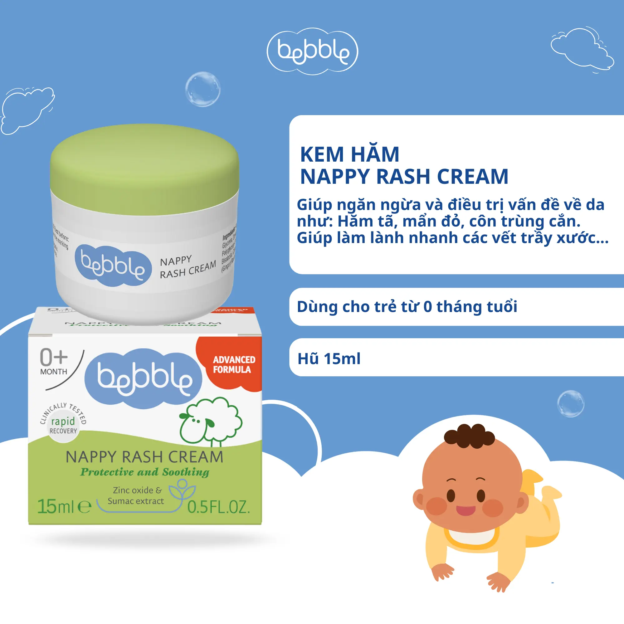 Kem hăm tã Bebble Nappy Rash Cream 60ml, dịu da tức thì, làm dịu vết côn trùng đốt, dùng cho bé từ 0 tháng